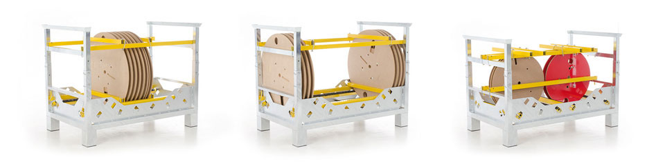 Do you need to transport your reels horizontally and safely? That can be easily done, with our specially developed racks. We manufacture the rack to fit according to the reel diameter. The length of the powder-coated bars is adjustable and can be adapted to accommodate the number of reels being transported. A high-strength multiplex panel serves as the carrier platform. Skids made of solid wood and strong metal rods provide safe processing using the fork lift.